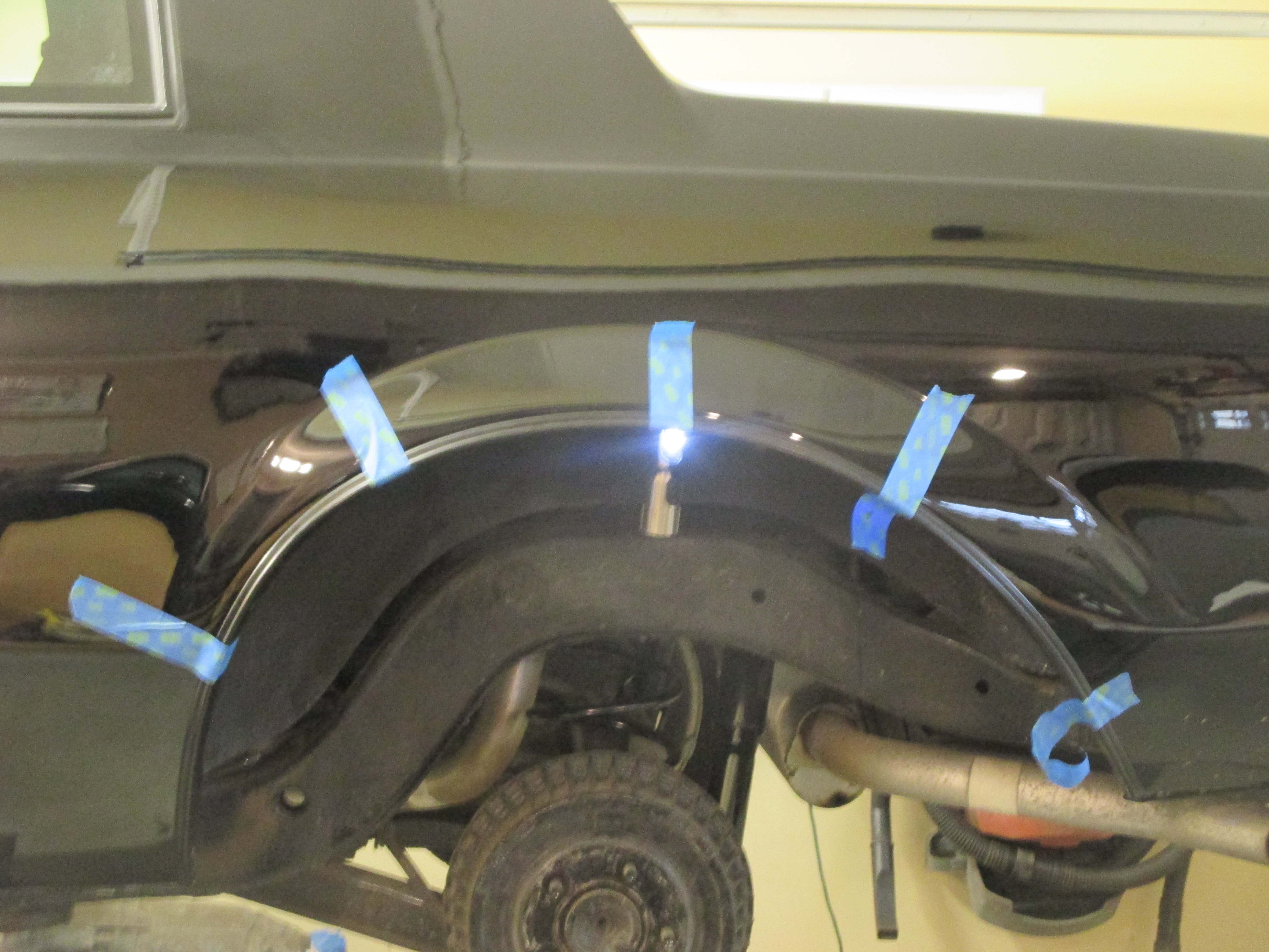 Wheel well trim installed. Driver’s side rear: the old screws were braked of in the quarter panel. The head were covered over in bondo and painted. We re-drilled the holes and installed the trim.