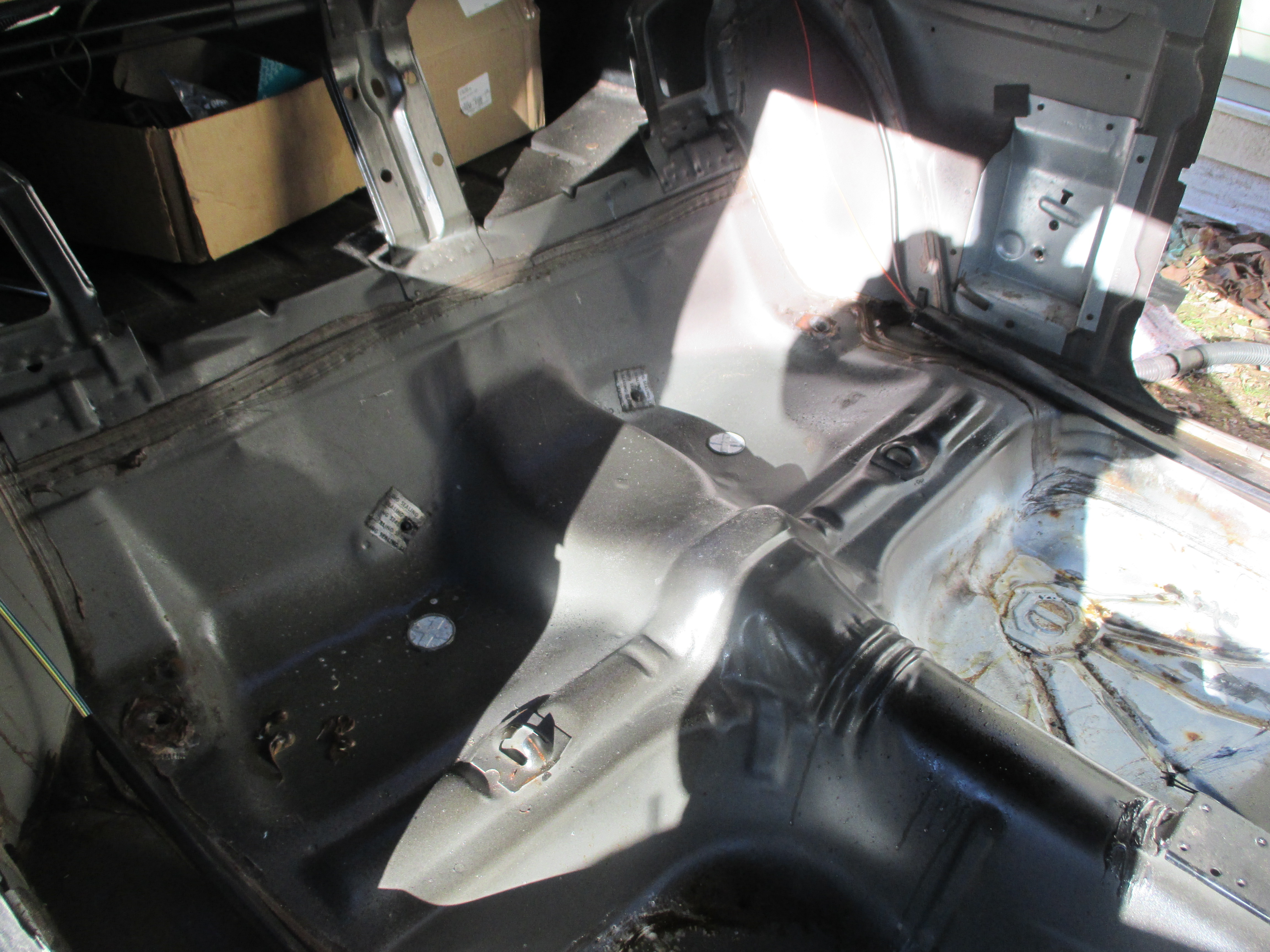 After removing the carpet and the many dead rodents we only needed to get past the horrible stench of the dead. The floor was soaked in bleach. the sanded to remove any surface rust and loose pieces. Once clean the floor was sprayed with a rust inhibitor and then painted. The floors are solid and a good platform to work from.